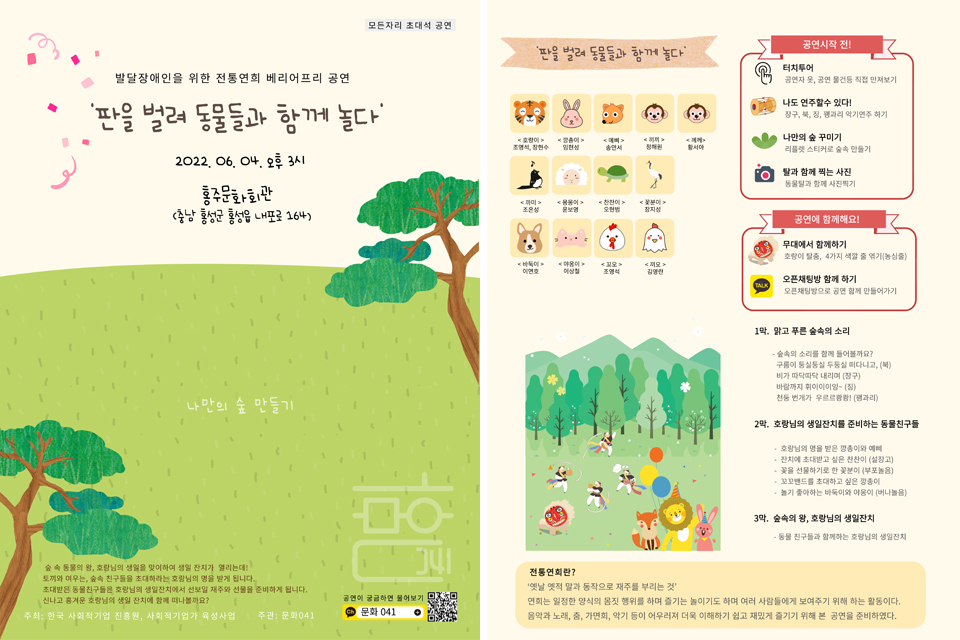 베리어프리 공연 ‘판을 벌려 동물들과 함께 놀다’는 호랑님 생일잔치를 위해 갖가지 재주있는 동물들을 찾아 떠나는 여정을 그린 전통연희극으로, 발달장애인을 비롯한 가족과 관계자들이 흥미롭고 편안하게 공연을 관람할 수 있도록 △터치투어 △사물악 소리체험 △나만어 숲 만들기 △12지신 포토존 등 다채로운 즐길 것이 함께 준비됐다.
