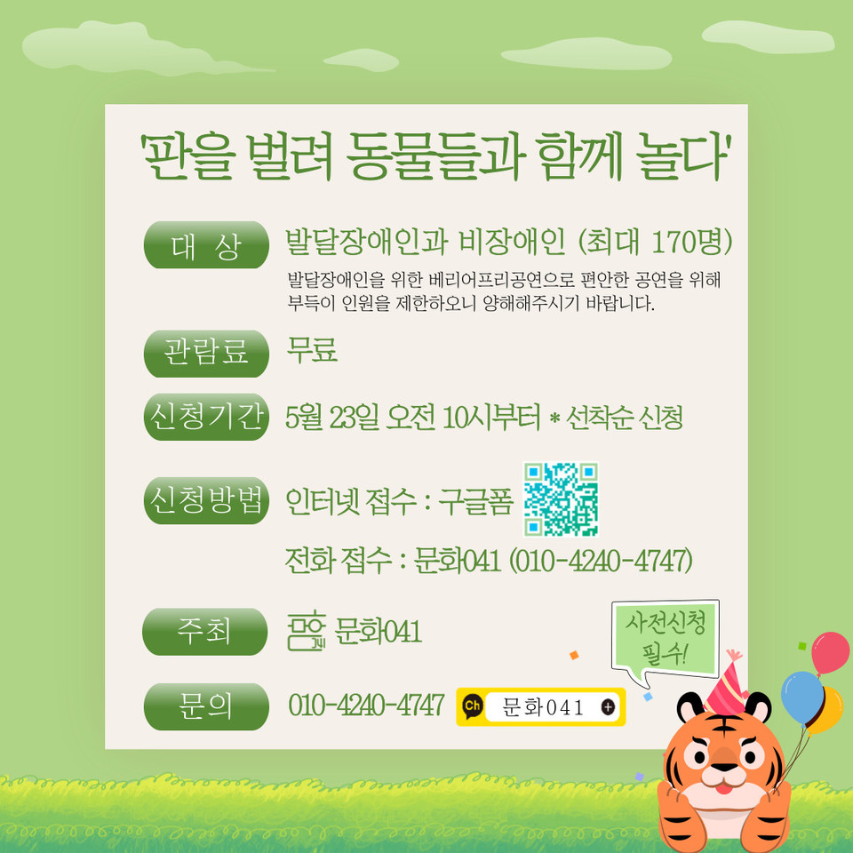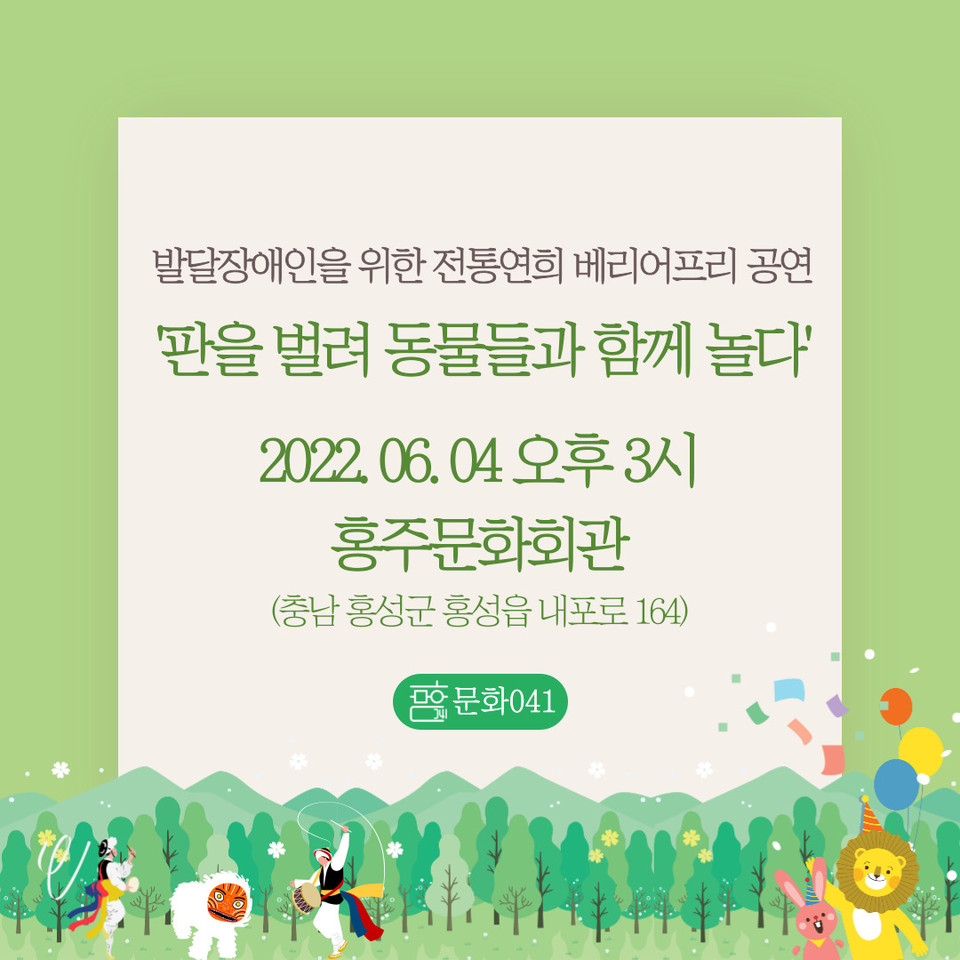 한국사회적기업진흥원의 사회적기업가 육성사업의 일환으로 홍성군 문화단체인 ‘문화041(대표 임현성)’이 발달장애인의 특성을 고려한 베리어프리 공연인 ‘판을 벌려 동물들과 함께 놀다’를 다음달 4일 홍주문화회관 대공연장에서 개최한다.