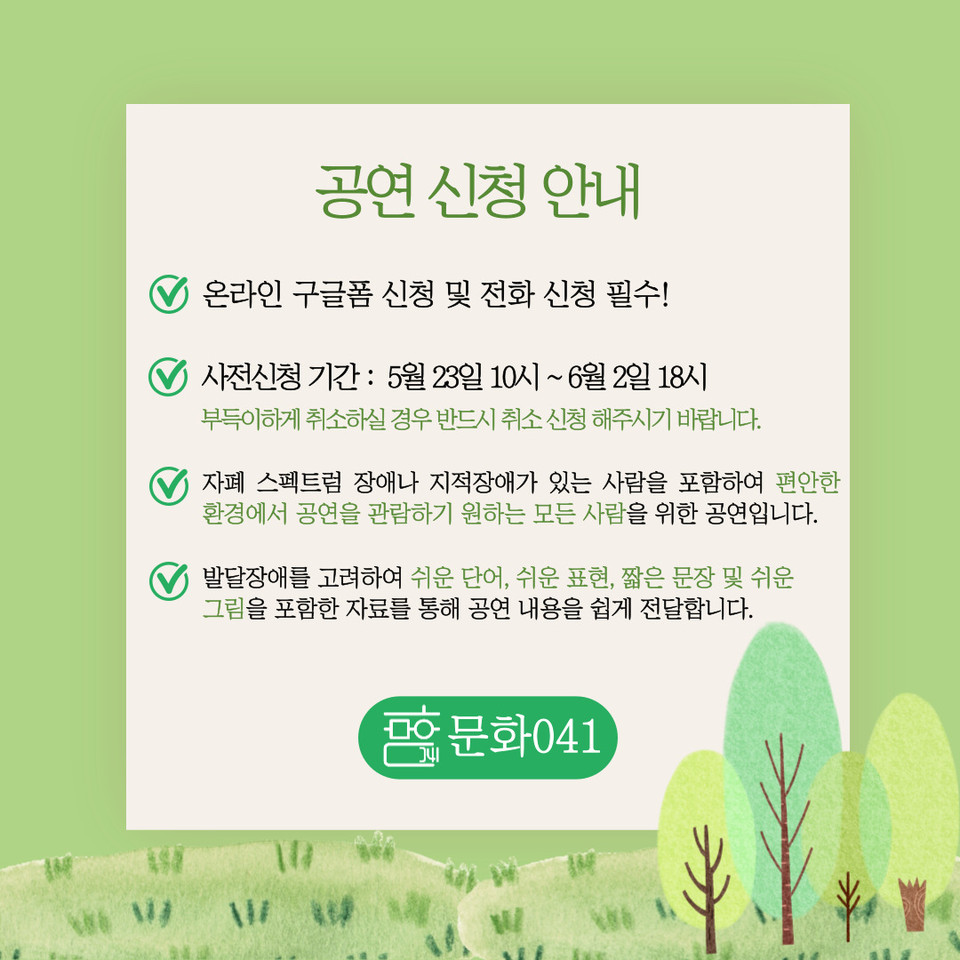 특히 공연중 화장실을 다녀오거나 노래와 대사를 따라해도 되는 등 자유로운 분위기로 펼쳐질 예정이며, 170명 제한 관람으로 여유있는 공간에서 공연을 즐길 수 있다. 또 발달장애인이 재미를 느낄 수 있는 연희 컨텐츠와 쉬운 내용이 큰 글자로 인쇄된 리플렛은 공연을 즐기는 또 하나의 포인트가 될 것으로 보인다.
