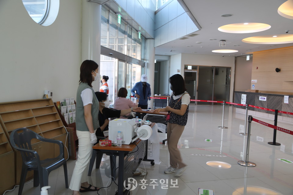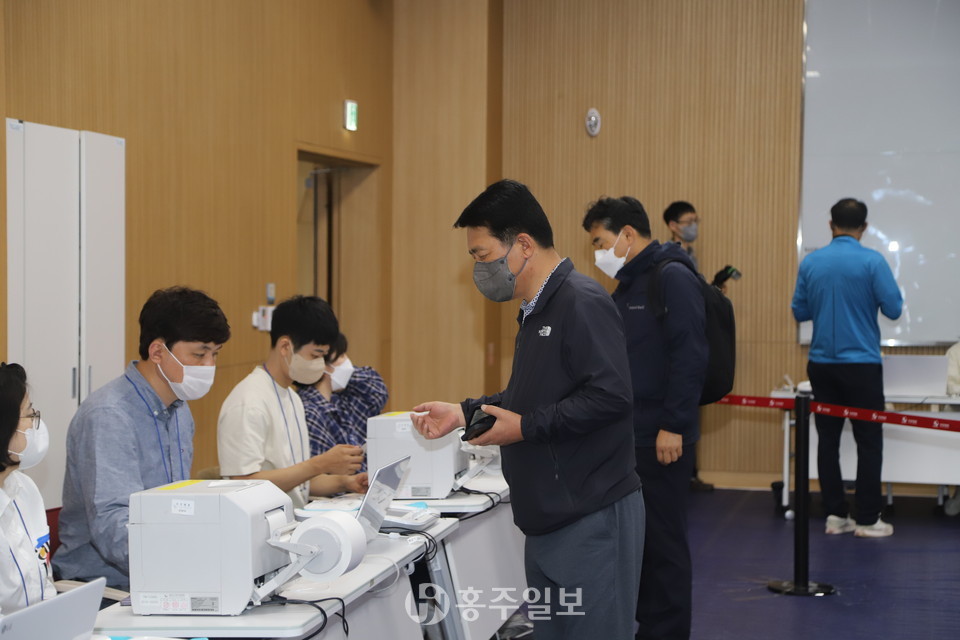 홍북읍 사전투표소인 충남도서관 문화교육동 1층에는 오전 7시 무렵부터 출근 전 투표를 마치려는 유권자들의 차량이 연이어 출입하며 행렬이 이어졌다. 지난 3월 치러진 대통령선거 때 관외 투표자들이 유독 많았던 홍북읍인 만큼 이번 지방선거에도 상당한 수의 관외 투표자들이 보였다.