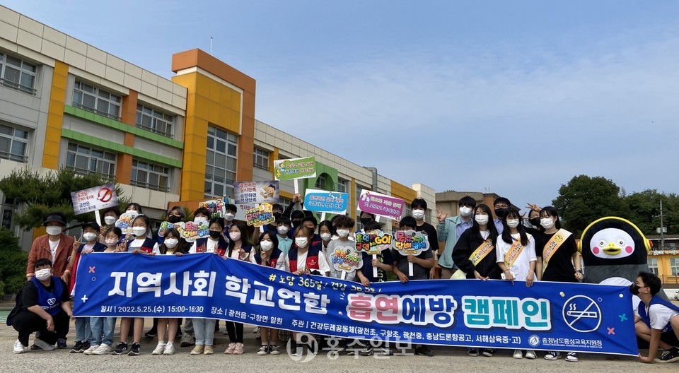 충청남도홍성교육지원청(교육장 주진익)은 지난 25일 광천지역 덕명학습장과 광천오거리 일원에서 학교 흡연 예방을 위한 관심을 높이고 공감형성을 위한 ‘2022년도 학교 흡연 예방 캠페인’을 진행했다.<사진>