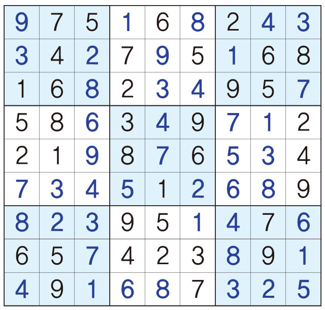 3. 큰 정사각형(9x9) 안에 있는 작은 정사각형(3x3) 안에는 숫자 1~9가 각 한 번씩 들어간다.