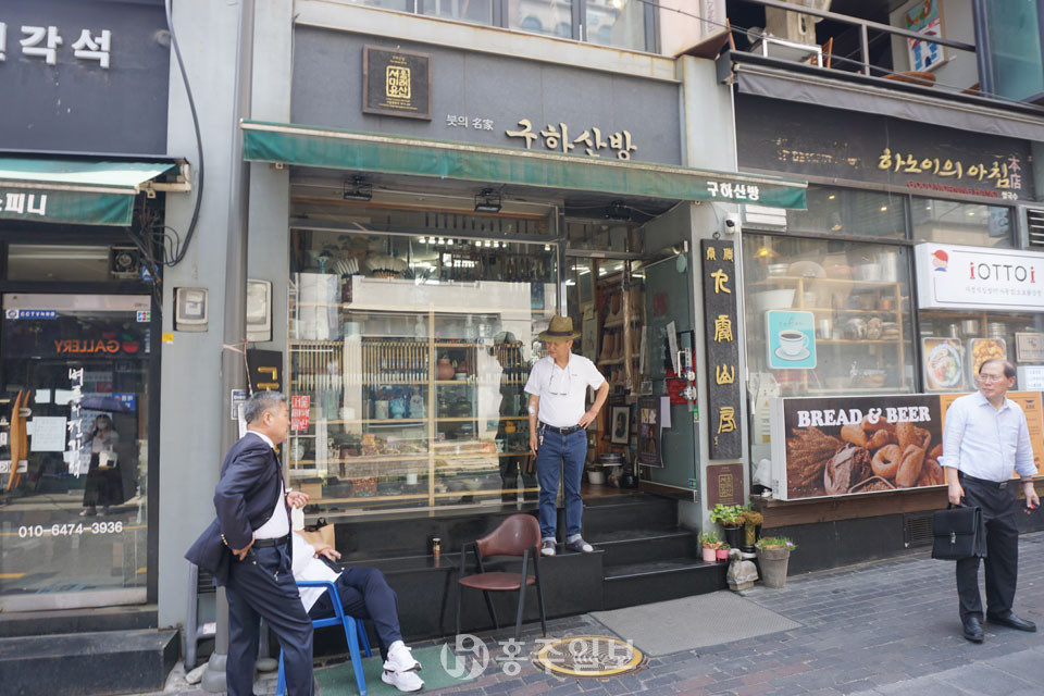 1913년 처음 문을 연 한반도 최초의 필방인 ‘구한산방’은 ‘구한말에는 고종임금과 순종임금도 애용했던 필방’이라고 설명한다. 임금이 애용하면서 구하산방의 붓이 궐에도 소문났을 정도니, 당대의 내로라하는 ‘묵객’들은 모두 이곳의 문지방이 닳도록 드나들었던 것이다.