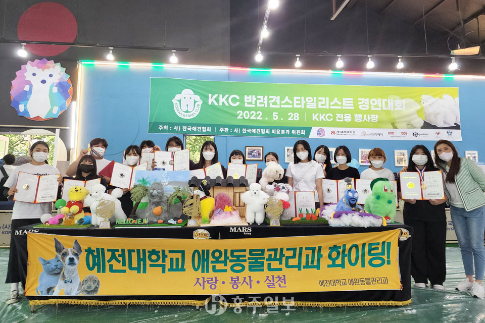 혜전대학교(총장 이혜숙) 애완동물관리과 학생들이 지난달 28일 (사)한국애견협회가 주최한 ‘2022 KKC 반려견 스타일리스트 경연대회’ 학생부에 출전해 대거 수상의 기쁨을 얻었다. 이번 대회에서 푸들 Level B 부문에 출전한 1학년 강민성 학생의 금상 수상 등 각 부문에서 금·은·동·장려상을 수상했다.