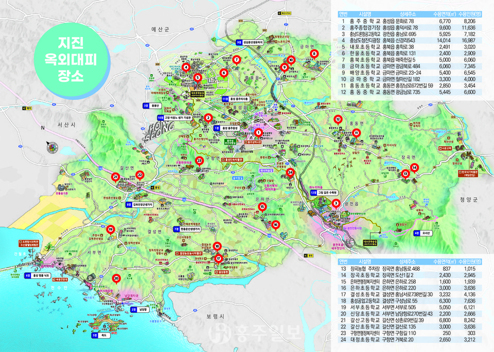 홍성군이 군민들에게 ‘지진 옥외대피장소’의 위치와 관련정보를 안내해주는 안내지도<사진>를 제작·배부한다.