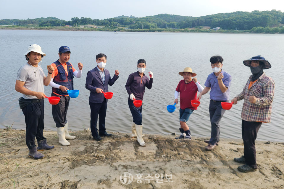 홍성군이 내수면 수산자원 확보와 어업인 소득증대를 위해 지난 3일 약 1만 마리의 참게 종자를 홍양저수지에 방류했다.<사진>