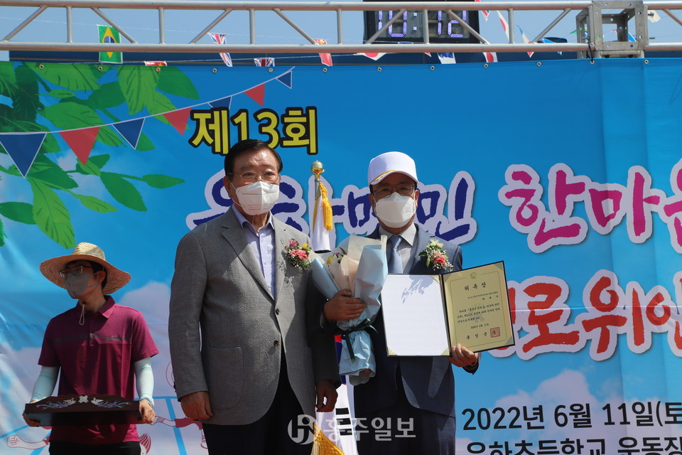 이날 행사에 앞서 박복수 씨가 명예면장에 위촉됐으며 △지역개발 부문에 맹달영 씨가 △사회봉사 부문에 오덕근 씨가 △체육진흥 부문에 오종석 씨가 △효행 부문에 송미경 씨가 유공자로 표창을 받아 박수를 받았다.