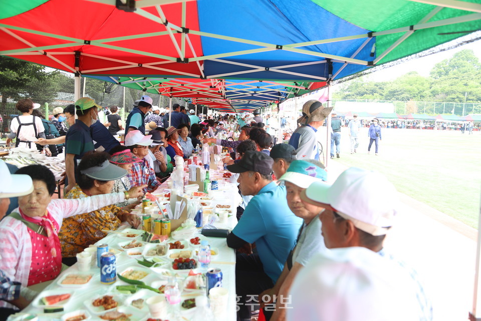 체육대회는 풍물패를 선두로 11개 지역팀이 입장하는 것부터 시작됐다. 읍민들은 각 팀의 팻말을 들고 순서대로 입장한 이후 각 지역팀의 자리에 비치된 간이 의자와 양산으로 더위를 피했다.