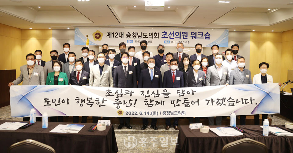 충남도의회(의장 김명선)는 지난 14일 예산 스플라스 리솜에서 6·1지방선거 초선의원 당선인 32인을 대상으로 의정활동 흐름과 조례안 만들기 등 의정활동 역량 강화를 위한 워크숍을 개최했다.<사진>