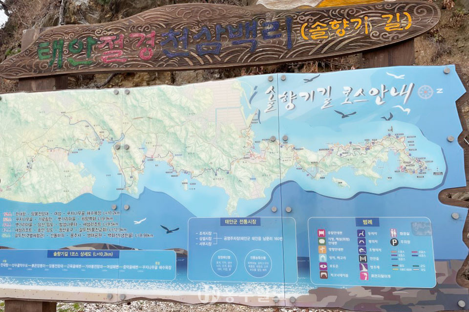 안면도의 탁 트인 바다와 울창한 소나무숲, 그리고 정화된 태안의 힘으로 마음까지 치유되는 매력을 발산하며, 이 길을 다시 찾은 자원봉사자뿐 아니라 이제는 전국의 트레킹 코스로 각광을 받고 있다. △제1코스 이원면 만대항에서 여섬을 거쳐 꾸지나무골해수욕장까지(10.2㎞) △제2코스 꾸지나무골해수욕장에서 가로림만을 거쳐 희망벽화방조제까지(9.9㎞) △제3코스 희망벽화 방조제에서 밤섬 나루터를 거쳐 새섬까지(9.5㎞) △제4코스 새섬에서 청산포구를 거쳐 갈두천까지(12.9㎞) △제5코스 갈두천에서 용주사를 거쳐 백화산 냉천골까지(8.9㎞)이다. 이와 함께 △제6코스는 안면도 공영주차장에서 승언저수지, 꽃지해안공원과 안면도 조각공원을 거쳐 안면장터까지(15.5㎞) 새롭게 조성된 솔향기길 걷기에 설레이는 마음까지 갖게 한다.