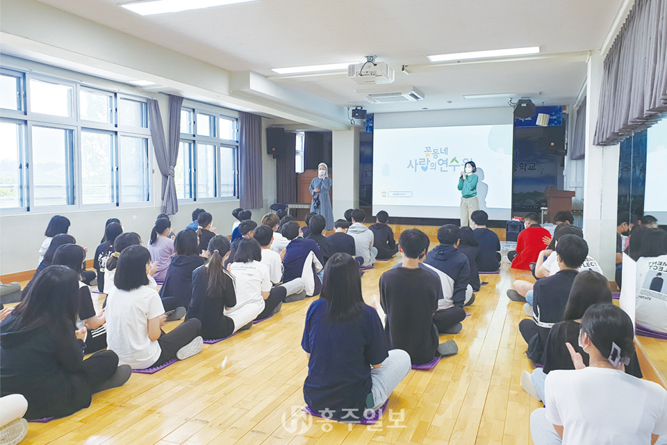 금마중학교(교장 류양걸)는 지난 10일 다목적실에서 홍성군자원봉사센터(센터장 방은희)와 함께 금마중 전교생을 대상으로 꽃동네 사랑의 연수원의 ‘찾아가는 수련 활동’을 했다. 이날 활동을 통해 학생들은 장애 체험, 바른말 교육 등을 받았다.<사진>