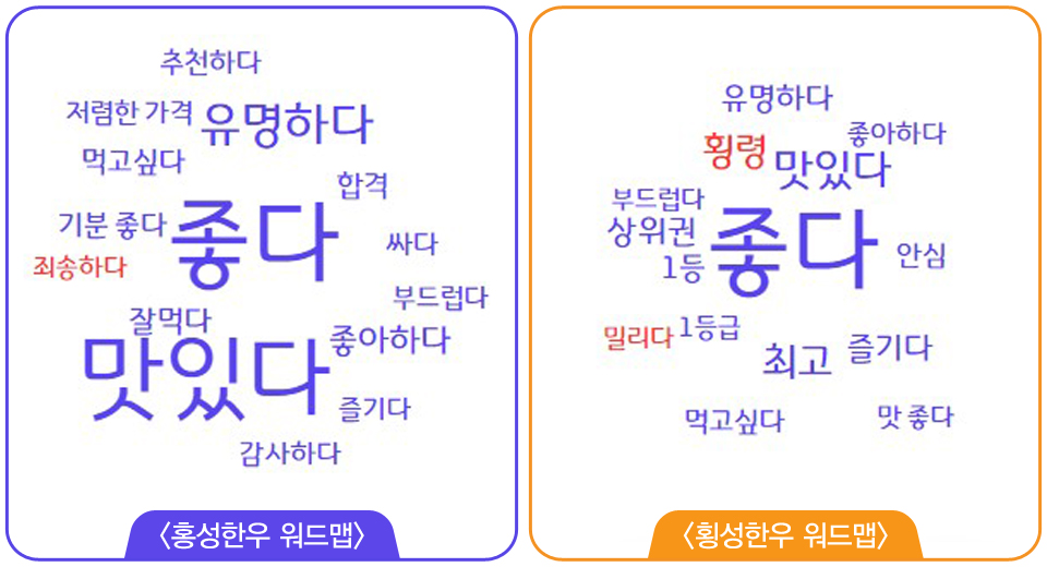 한편, 홍성한우와 횡성한우 모두 ‘맛있다’와 ‘좋다’가 긍정단어 1~2위를 차지했다. 홍성한우는 ‘유명하다’가 뒤를 이었고, 횡성한우는 ‘좋다’와 ‘맛있다’에 이어 ‘최고’라는 긍정어가 워드맵에 크게 표시됐다.