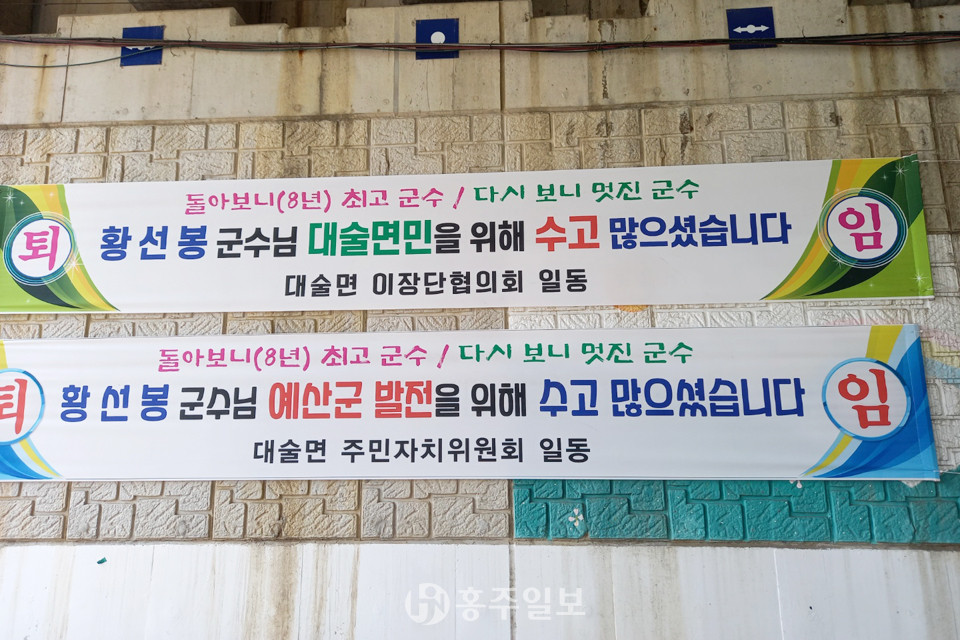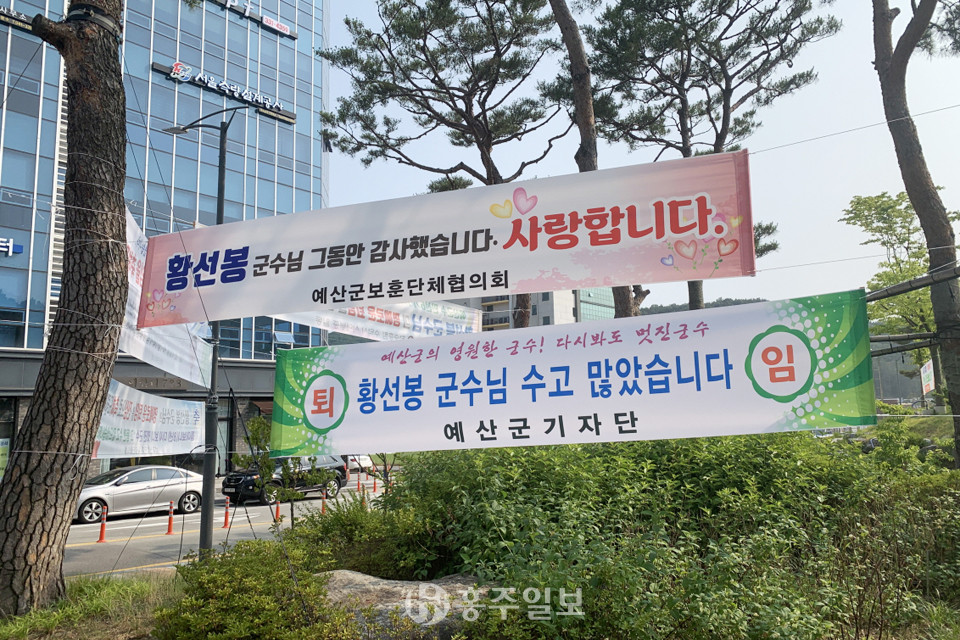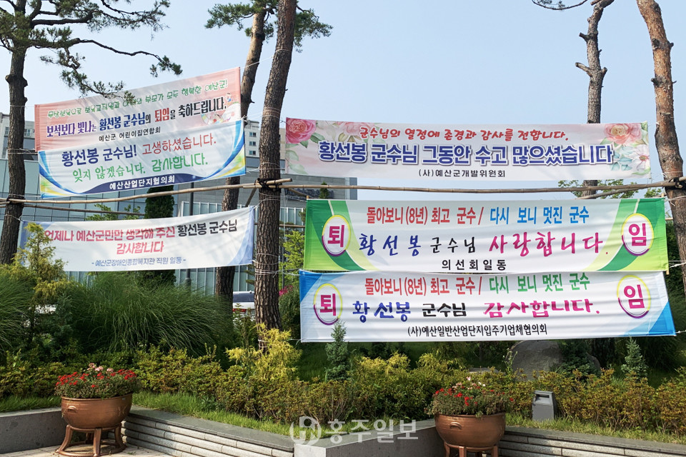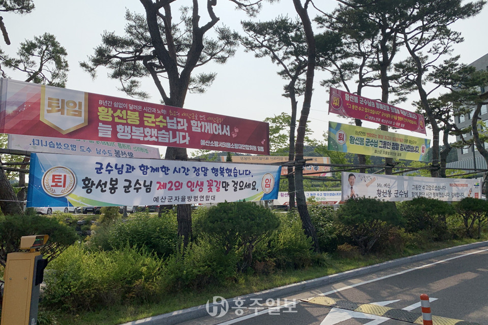 황선봉 예산군수가 이달 말 퇴임을 앞둔 가운데 예산군 지역사회 곳곳에 내걸린 현수막들이 눈길을 끌고 있다.