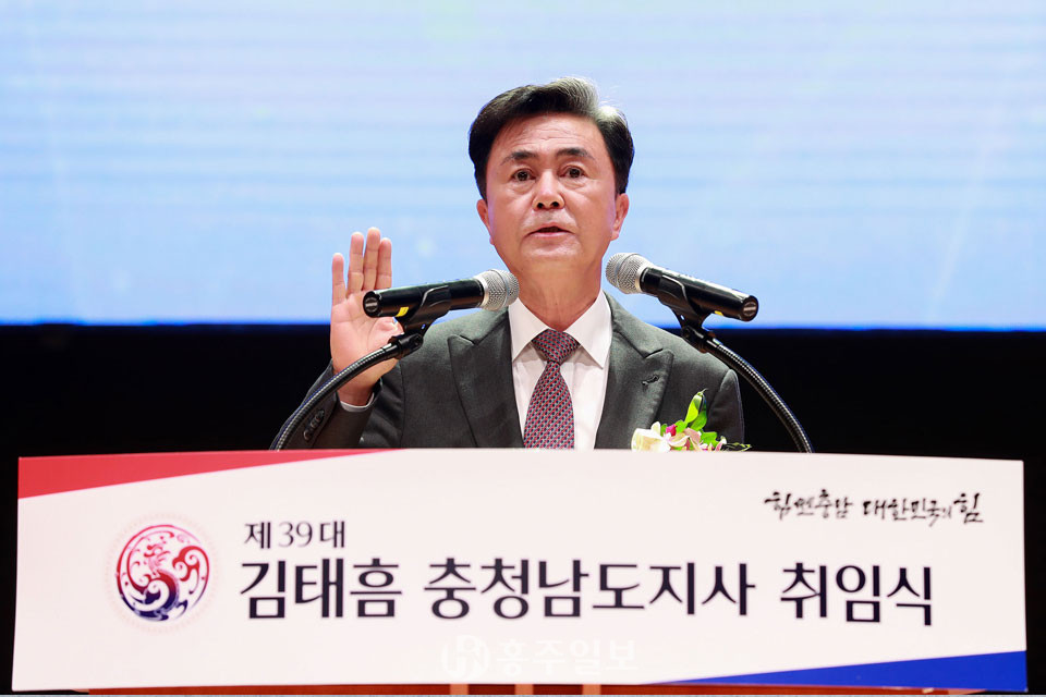 민선8기 충남도정을 이끌 김태흠 제39대 충남도지사가 지난 1일 도청 문예회관에서 취임식을 갖고 경제 성장을 바탕으로 한 ‘힘쎈충남’ 시대의 개막을 선언했다.<사진>