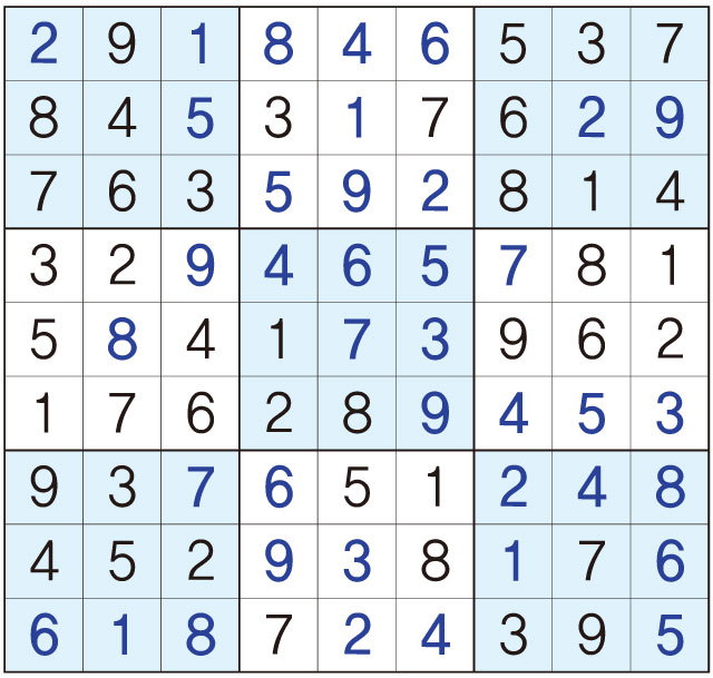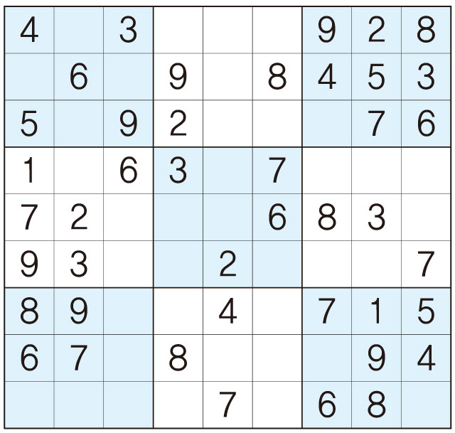 3. 큰 정사각형(9x9) 안에 있는 작은 정사각형(3x3) 안에는 숫자 1~9가 각 한 번씩 들어간다.
