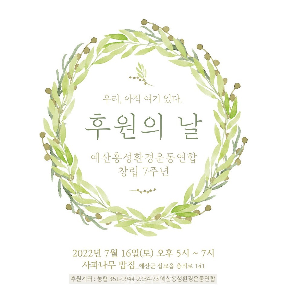예산홍성환경운동연합(이하 연합)이 창립 7주년을 맞아 오는 16일 후원의 날 ‘우리, 아직 여기 있다’를 개최한다.