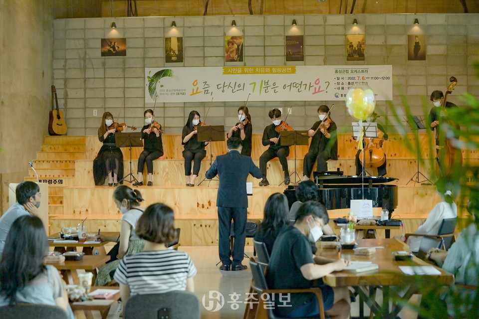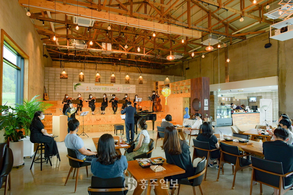 홍성군립오케스트라는 지난 6일 홍성복합문화창업공간 잇슈창고에서 지역 임산부를 위한 ‘태교 음악회-안녕!아가야~ 너는 잉태부터가 축복이야!’를 개최했다.<사진>
