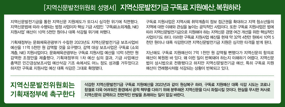 아울러 ‘윤석열 대통령과 기재부는 당장 지역신문기금부터 복원하라. 2005년 200억 원 규모로 시작한 기금이 70~80억 원대로 졸아든 지금, 오히려 전향적인 미디어 지원정책으로 지역 민주주의와 지역균형발전의 초석을 마련하라’고 덧붙였다.