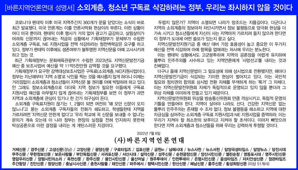 성명서에는 ‘소외계층 구독료지원이 끊기는 1~2월에는 여전히 ’왜 오던 신문이 안 오느냐‘고 묻는 소외계층들의 전화가 쇄도하고, 학생들한테 지역을 가르치려면 지역신문만한게 없다며 우리 학교에 꼭 신문을 보내줄 수 없냐는 문의가 계속 오는데 이 나라 정부는 현장의 실정을 전혀 인지하지 못한채 탁상공론으로 이런 결정을 내리는 게 개탄스러운 지경이다’며 ‘이는 펜데믹 상황에서도 고군분투하며 지역의 공론장을 어렵게 유지하며 풀뿌리 민주주의를 사수하고 있는 지역언론에게 사망선고를 내리는 것과 진배없다’고 비판했다.