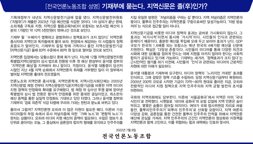전국언론노동조합은 8일 ‘기재부에 묻는다. 지역신문은 졸인가’ 제목의 성명에서 ‘특별법의 상시법 전환은 형식적 안정화를 위한 중대한 결실이었고 최소한의 예산증액을 통한 실질적 안정화도 기대하고 있었다’며 ‘그러나 윤석열 정부와 기재부의 경로의존적 삭감타령에 우리의 기대는 한탄과 분노로 바뀌고 있다’고 비판했다.