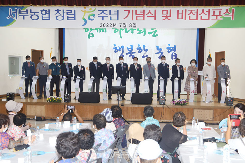 또한 표 조합장은 “비전선포는 서부농협에 있어 또 하나의 새로운 출발점이라고 생각한다”며 “농업인 소득증대, 지역발전을 선도하고 지역사회와 함께하기 위한 서부농협의 비전, 목표, 세부 추진계획을 달성하기 위한 힘찬 출발을 이 자리에서 선포한다”라고 강조했다.