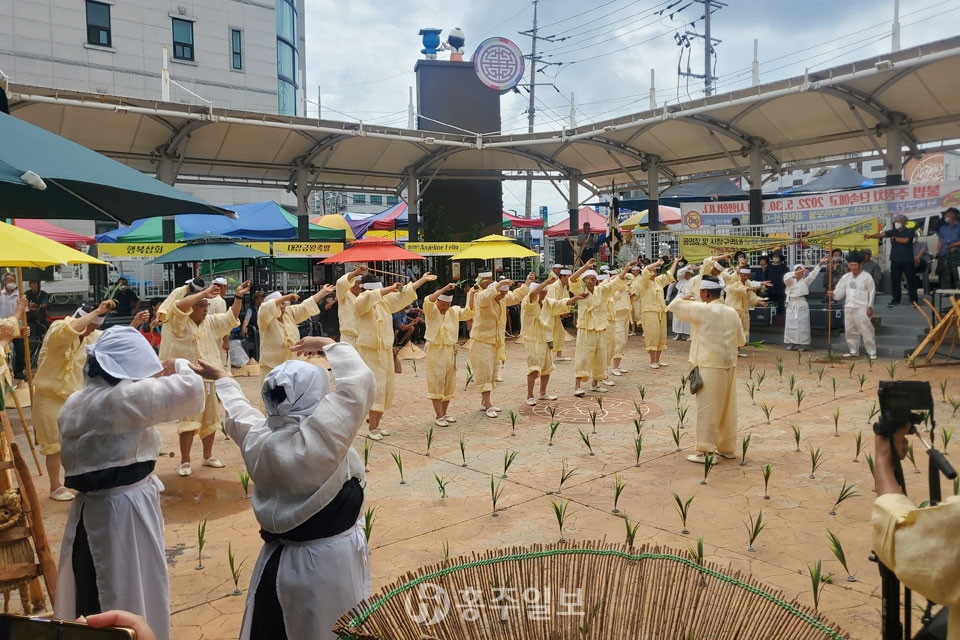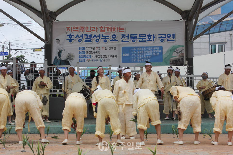 홍성결성농요보존회(회장 이진우)가 지난 11일 오일장이 열린 홍성전통시장에서 ‘지역주민과 함께하는 홍성결성농요 전통문화 공연’을 개최했다.<사진>