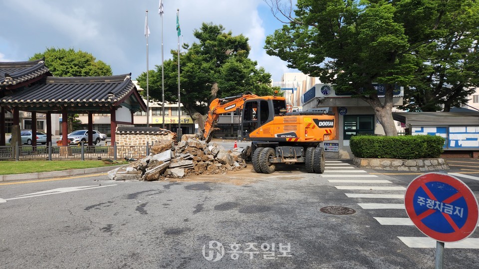 홍성군청 정문 기둥이 철거됐다.<사진> 홍성군청 정문은 국가지정문화재로 지정된 홍주아문과 연장된 형태로 현대식 화강석 기둥으로 제작돼 주변 문화재 경관과 어울리지 않는다는 지적이 있었고, 문주 간 거리가 좁아 양방향 차량 교행이 불가능하고 안전사고가 빈번히 발생하면서 민원인들의 불편을 초래해왔다.