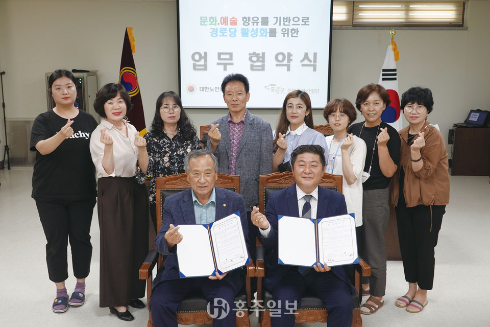 (사)대한노인회 홍성군지회(회장 조화원)와 홍성군 문화특화사업단(단장 모영선)은 지난 11일 어르신들의 행복한 문화생활을 누릴 기회를 마련하고 경로당 활성화에 협력하고자 업무협약을 체결했다. 양 기관은 △맞춤형 프로그램개발 △경로당 여가문화 형성 △다양한 정보공유 △어르신의 행복한 삶을 영위하기 위한 거점 공간 경로당 활성화 사업 등을 펼친다.