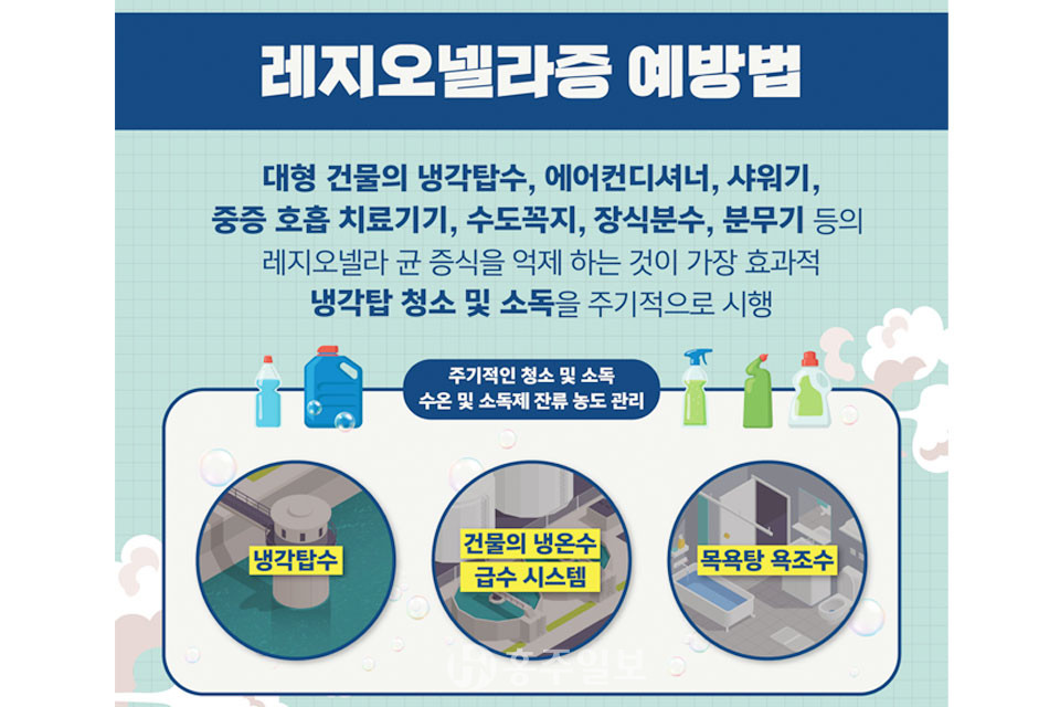 임현영 군 보건소 감염병대응팀장은 “다중이용시설 관리자들은 레지오넬라증 발생을 예방하기 위해 냉각탑수와 급수시설 등을 주기적으로 청소와 소독하는 것이 중요하다”라며 “가정 내에서도 냉방기기를 점검하고 주기적 청소로 레지오넬라균이 증식하지 않도록 관리 해야한다”라고 당부했다.