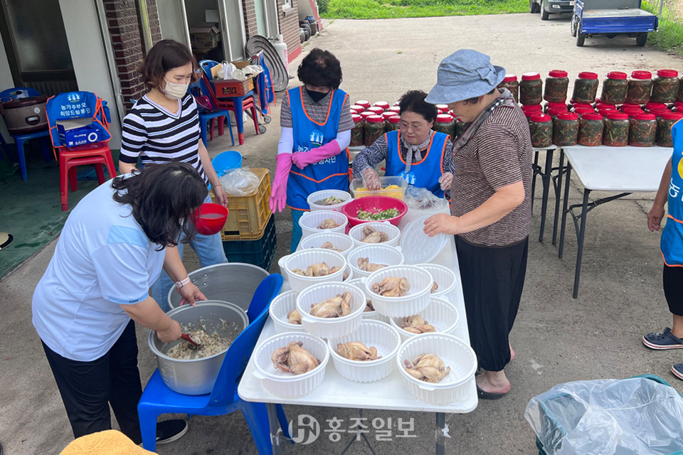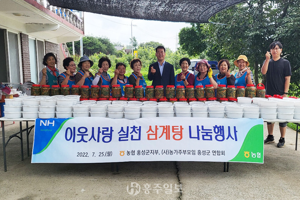 NH농협 홍성군지부(지부장 한만철)와 (사)농가주부모임 홍성군연합회(회장 김경자)는 25일 관내 취약가구 대상 나눔 활동으로 이웃사랑 실천을 위한 삼계탕 나눔행사를 실시했다.<사진>
