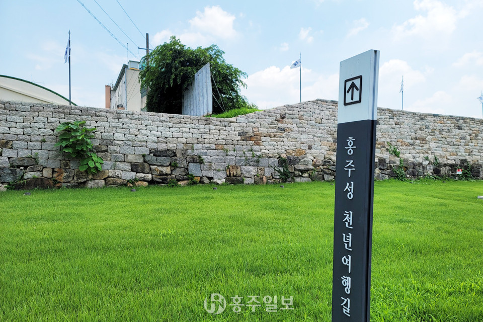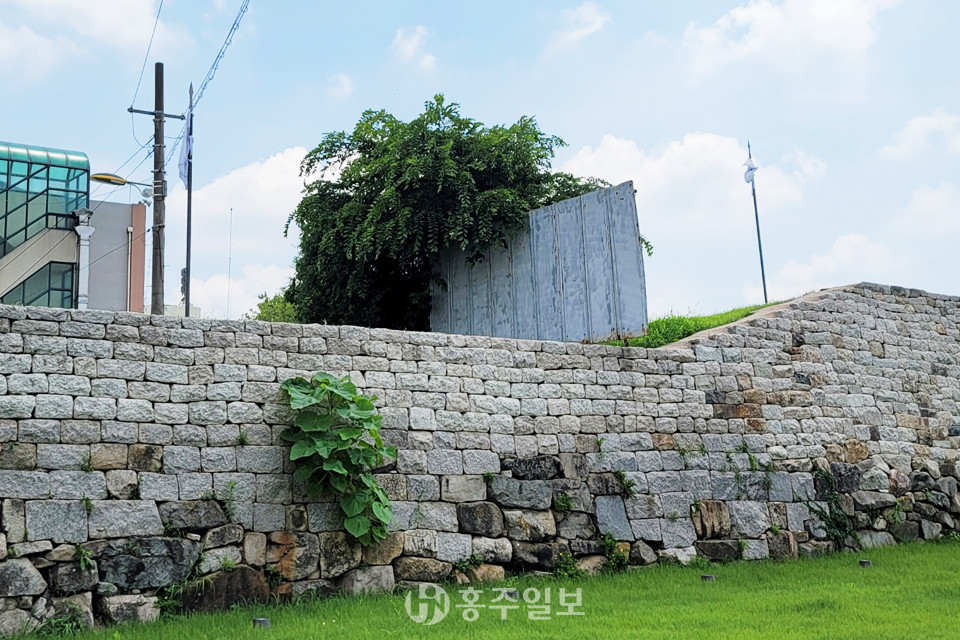홍주초등학교와 홍성군청 사이 홍주읍성 성곽에는 요상한 흉물이 있다. 바로 거대한 철재 ‘공사용 임시시설물’이 주인공이다. 녹이 슬고 찌그러져 있으며 석재성벽과 너무 어울리지 않는 구조물이다.