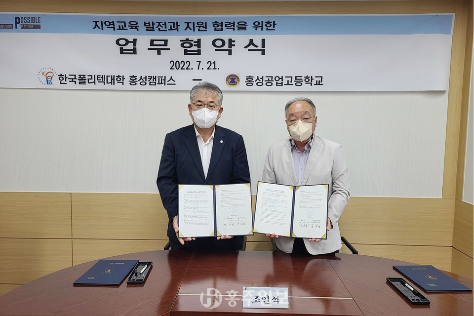 한국폴리텍대학 홍성캠퍼스(학장 장우영)는 지난 21일 대학본부 회의실에서 참된 교육력 제고를 위해 교육공동체를 구축하고 지역 특성화 직업교육과정 지원을 위한 홍성공업고등학교(교장 남상출)와 업무협약을 체결했다.
