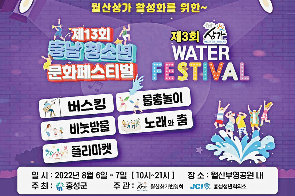 다음달 6일부터 7일까지 이틀간 월산상가번영회(회장 이승주)와 홍성청년회의소(회장 이현진)가 주관한 ‘제3회 월산상가 번영회 거리문화 축제’, ‘제13회 충남 청소년 문화 페스티벌’, ‘제3회 WATER FESTIVAL' 등 축제가 월산부영공원에서 진행된다.