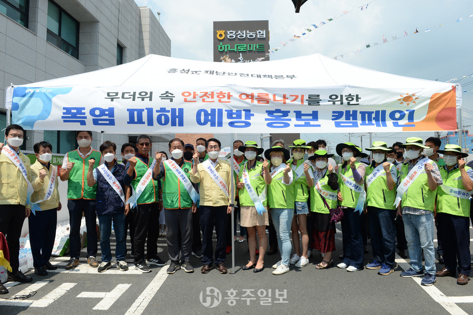 이날 캠페인은 이용록 홍성군수를 비롯해 홍성군지역자율방재단, 안전보안관, 시민안전봉사대 등 다양한 단체가 참여했으며, 홍성읍 하나로마트 입구에서 군민에게 양산과 얼음물을 나눠주고 폭염국민행동요령 리플릿을 배부하면서 코로나19와 더위로 지친 군민들의 고충을 듣는 시간을 가졌다.