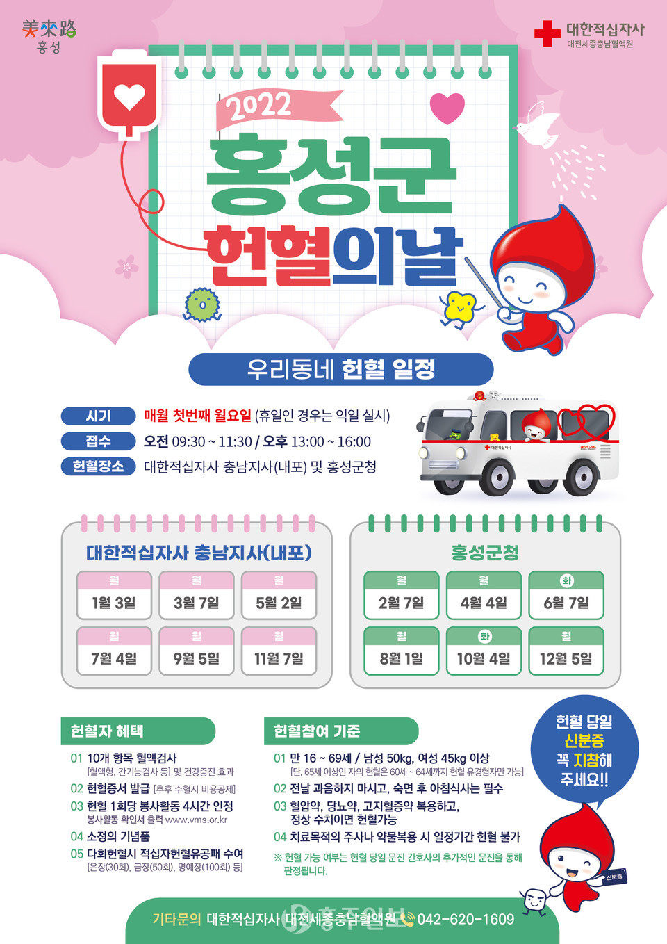 현재 매월 첫째 주 월요일 헌혈 버스가 운영되고 있으며 군민 누구나 헌혈할 수 있다. 홀수달은 홍북읍에 위치한 대한적십자사 충남지사, 짝수달은 홍성군청 앞에서 헌혈버스를 10시부터 16시까지 운영한다.