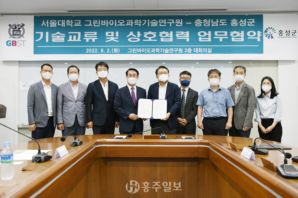 홍성군과 서울대학교 그린바이오과학기술연구원(원장 임정빈)이 지난 2일 농업분야 기술 교류와 상호협력 증진을 위한 업무협력 양해각서(MOU)를 체결했다.<사진>
