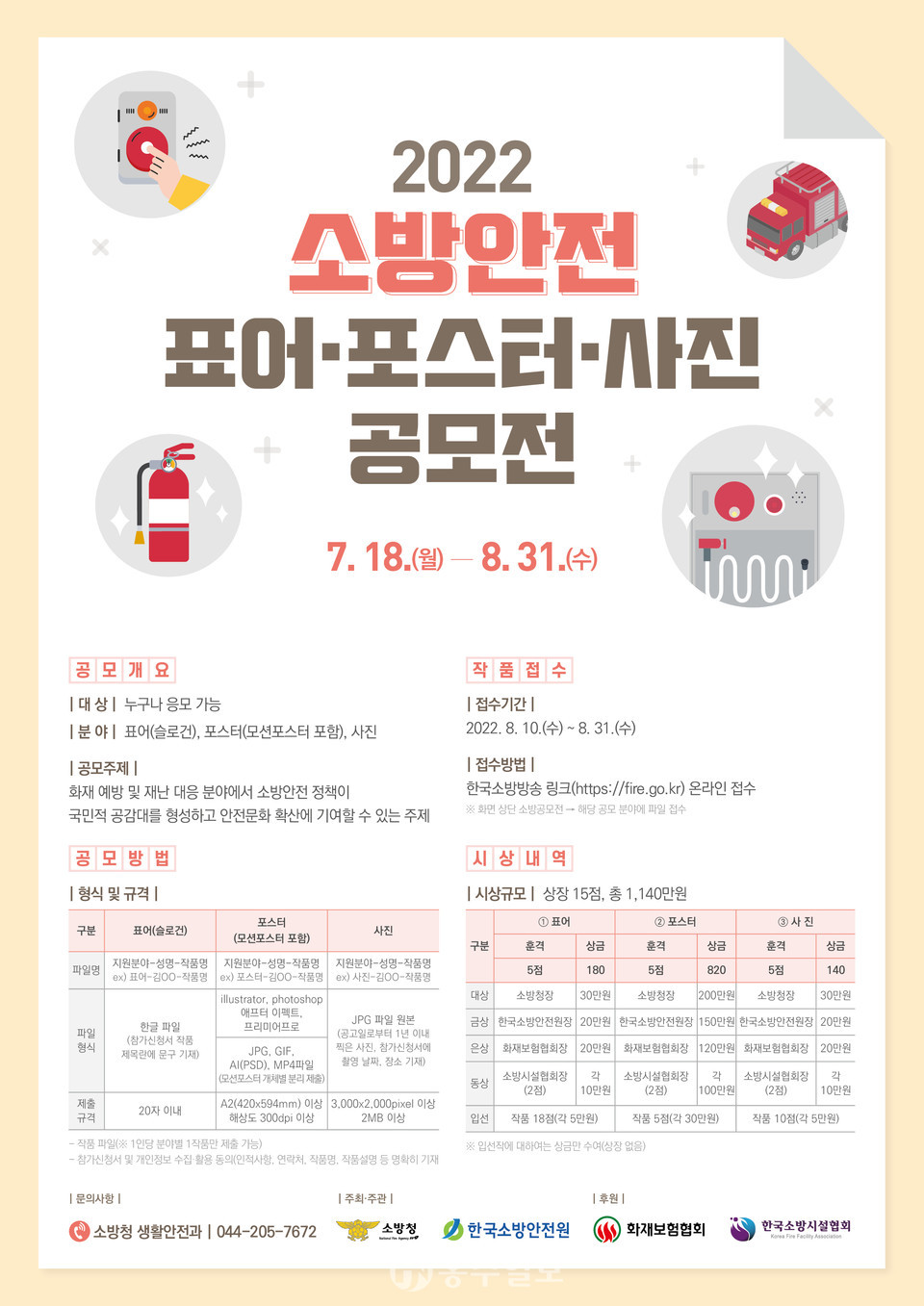 소방청과 한국소방안전원이 각종 재난·안전사고에 대한 경각심을 고취하기 위한 ‘2022년 소방안전 표어·포스터 및 사진 공모전’을 개최한다.