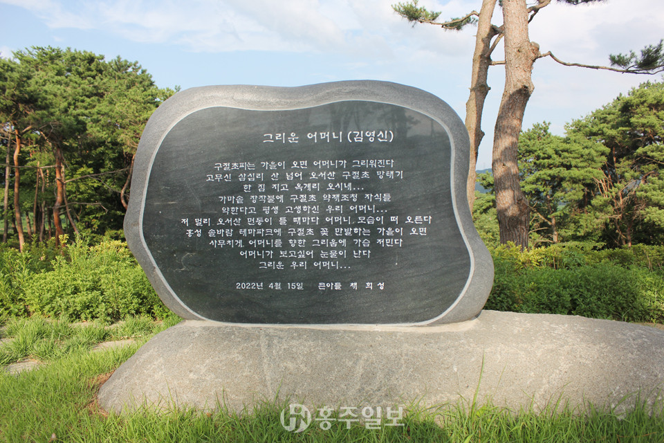 ‘구절초 피는 가을이 오면 어머니가 그리워진다. 고무신 삼십 리 산 넘어 오서산 구절초 망태기 한 짐 지고 옥계리 오시네….’ 장곡면 옥계리에 있는 홍성솔바람테마파크에는 돌아가신 어머니에 대한 그리움이 담긴 시비(詩碑)가 세워져 있다. 비에 적혀 있는 시는 옥계리 출신 출향인 채희성 회장(68)이 지은 ‘그리운 어머니(김영신)’다.