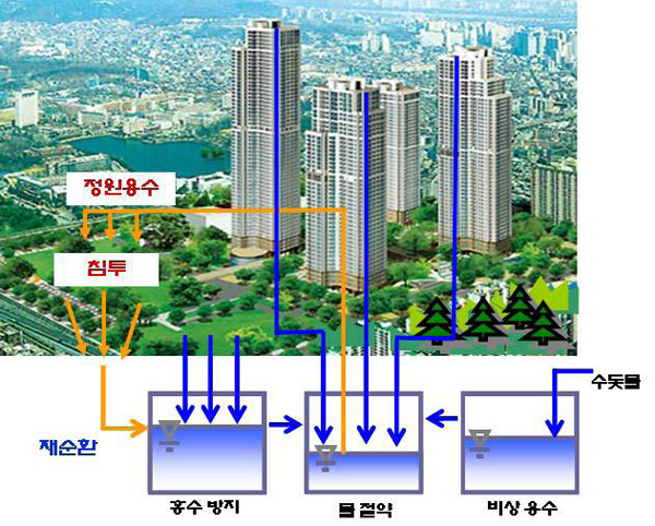 서울 광진구 자양동 주상복합건물 스타시티 지하에는 넓이 1500㎡, 깊이 2m의 대형 저수조가 있다. 3000톤의 물을 저장할 수 있는 용량이다. 이 시설은 5만㎡에 이르는 스타시티 건물 곳곳에 설치된 배수구에서 보내온 빗물을 모아두는 곳이다. 저수조 빗물은 건물의 공용화장실이나 화단을 관리하는 데 사용하고, 비상시에는 소방 용수로도 쓸 수 있다.