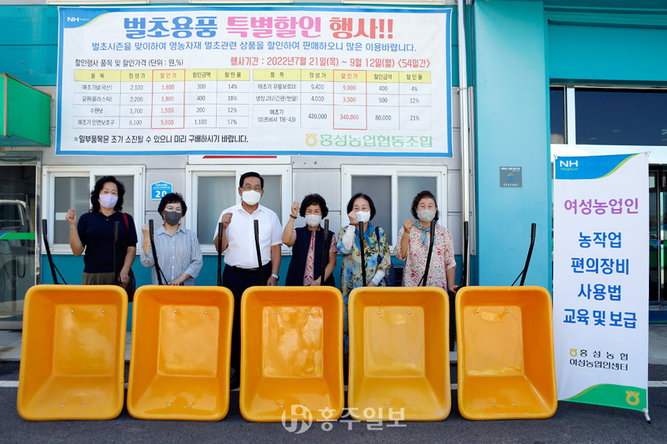 홍성농업협동조합(조합장 정해명)은 지난 16일 유통센터에서 농가주부모임 40명을 대표해 회장단 5명이 참석한 가운데 사업비 200여만 원을 들여 농작업 편의장비 총 40개를 전달했다.<사진>
