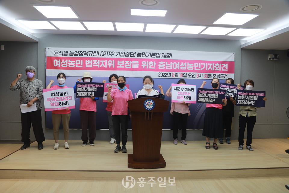 전국여성농민회총연합(이하 전여농) 충남도연합 준비위원회(준비위원장 서짐미)는 18일 충청남도 브리핑룸에서 ‘윤석열 농업정책규탄! CPTPP 가입중단! 농민기본법 제정! 여성농민 법적지위 보장을 위한 충남여성농민 기자회견’을 개최했다.<사진>