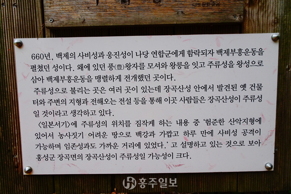 예산의 임존성과는 12.6㎞ 떨어져 있어 지리적 위치로 볼 때 백제 부흥군의 근거지였던 주류성으로 추정되고 있다. 물론 주류성의 정확한 위치와 관련해서는 이곳을 비롯해 충남 서천 건지산성(乾芝山城), 충남 청양 정산(定山), 전북 부안 우금산성 등 여러 주장이 제기되고 있다. 하지만 대동여지도를 제작한 김정호가 ‘홍주는 본래 백제의 주류성이다’라고 밝힌데다 ‘장곡산성이 주류성임을 입증하기 위한 많은 연구’가 진행되고 있다. 홍성군은 매년 10월 장곡산성에서 백제부흥운동을 재조명하고 의병들의 뜻을 기리기 위한 위령제를 지내고 있다.