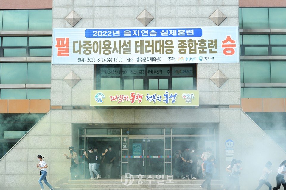 지난 24일 홍성군이 홍주문화체육센터에서 2022년 을지연습 테러 대응 종합훈련을 시행했다.