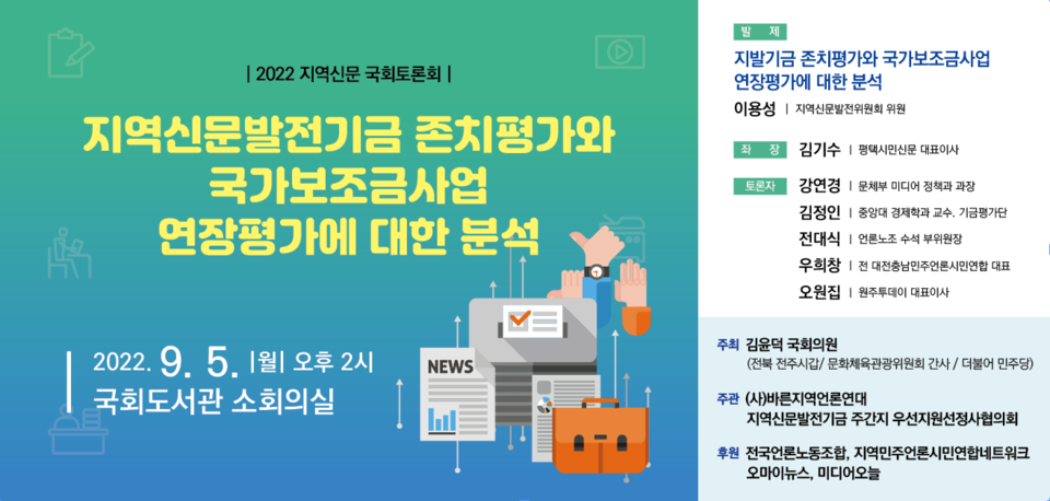 토론회는 이용성 지역신문발전위원회 위원의 주제발표(지역신문발전기금 존치평가와 국가보조금사업 연장평가에 대한 분석)를 시작으로 강연경 문체부 미디어 정책과 과장, 전대식 언론노조 수석 부위원장, 우희창 전 대전충남민주언론시민연합 대표, 오원집 원주투데이 대표이사, 김정인 중앙대 경제학과 교수 (기재부 기금평가단)가 토론자로 나선다. 좌장은 김기수 평택시민신문 대표이사가 맡았다.