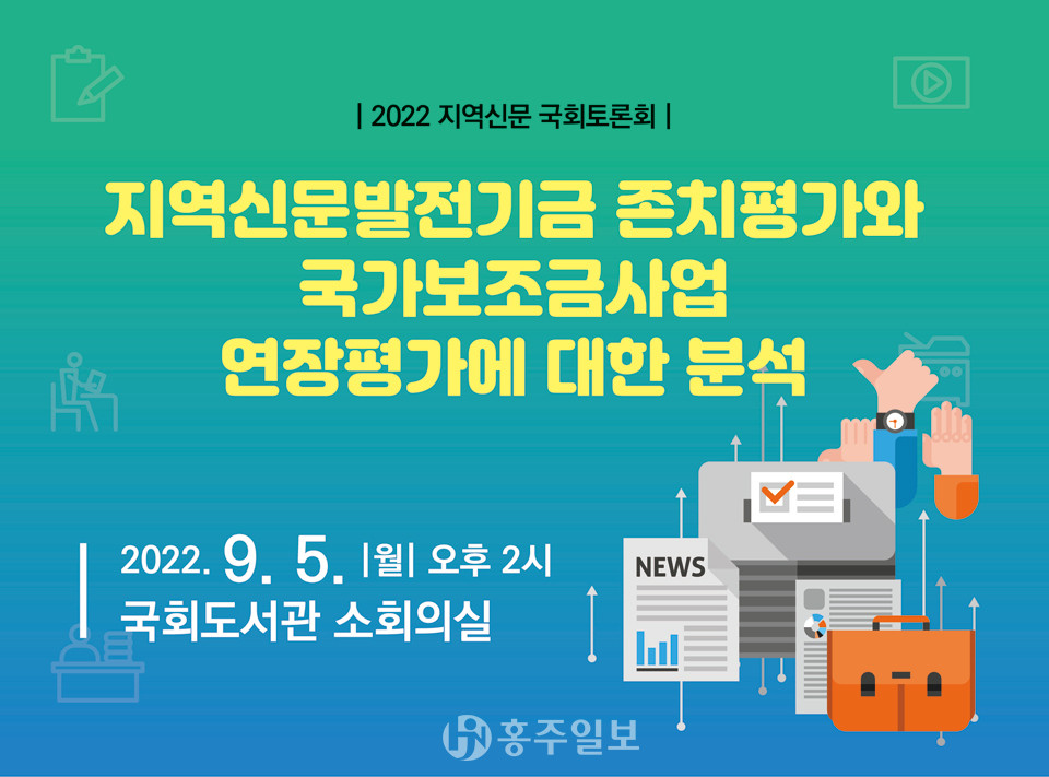 ‘지역신문발전지원특별법’에 따른 ‘지역신문발전기금 존치평가와 국가보조금사업 연장평가’를 주제로 국회토론회가 개최된다. 토론회는 기금존치평가와 국고보조사업 연장평가에 대해 분석하고 지역신문지원제도의 위기와 대응 방향을 모색하기 위해 마련됐다.