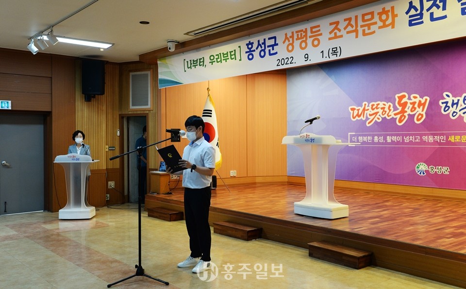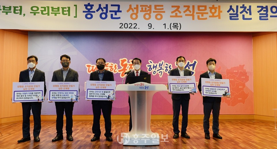 홍성군이 차별 없는 일터를 만들기 위해 ‘성평등 실천 5계명’을 발표하고 지난 1일 성평등 조직문화 실천 결의대회를 개최했다.