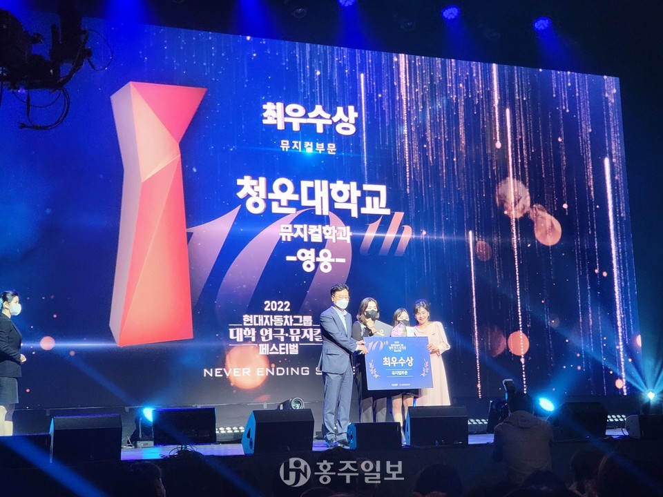 청운대학교(총장 이우종) 뮤지컬학과 ‘영웅’팀이 현대차그룹 뮤지컬연극페스티벌에서 뮤지컬부문 최우수상을 수상했다.<사진>