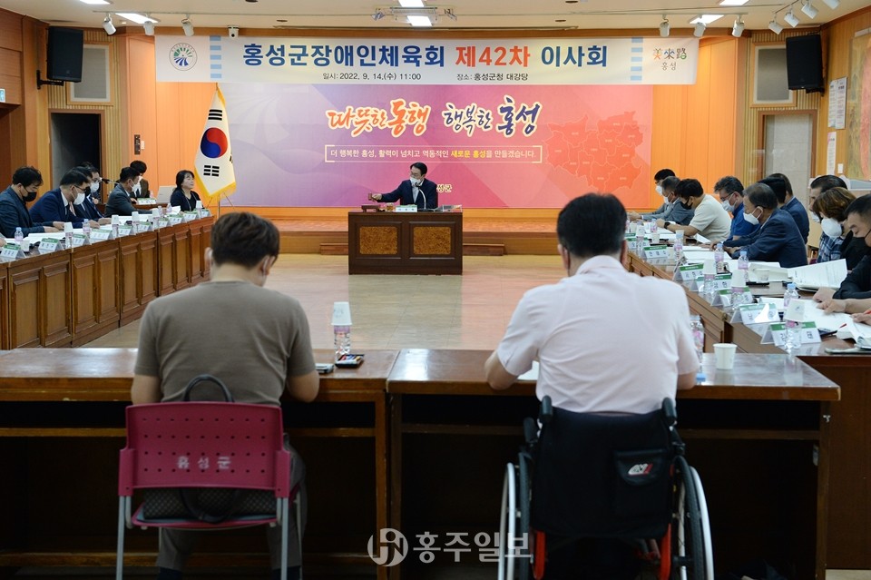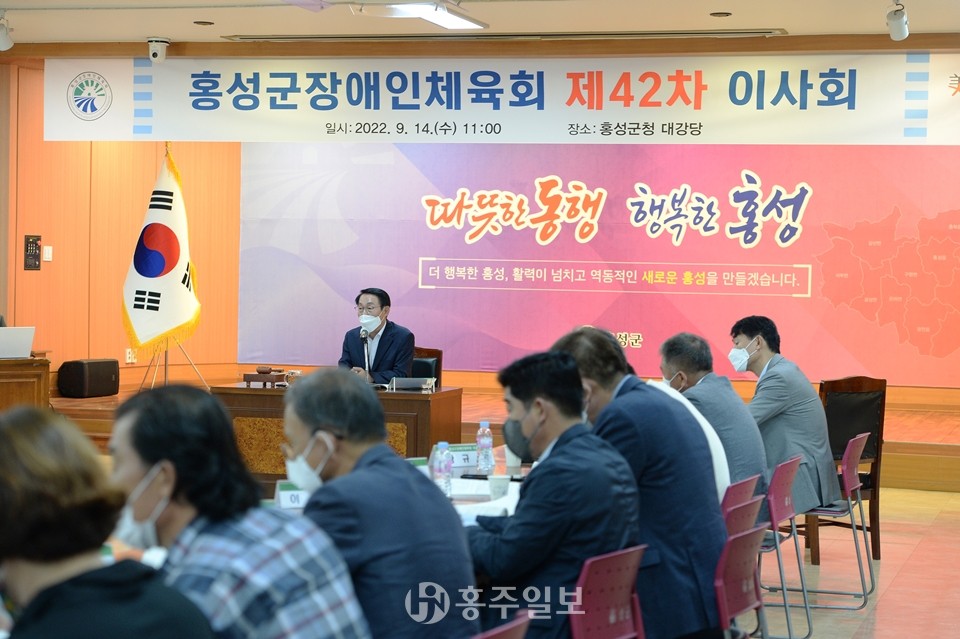 홍성군장애인체육회(회장 이용록 홍성군수)가 지난 14일 군청 대강당에서 제42회 이사회를 개최하고, 올해 개최 예정인 충남장애인체전과 전국장애인체전에서의 선전을 다짐했다.