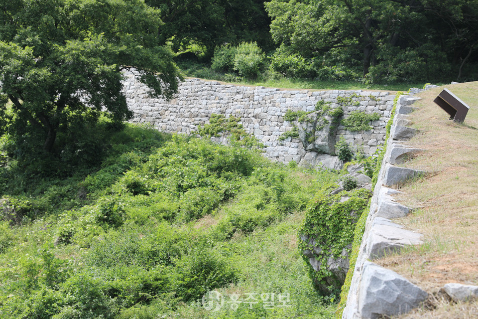 복원한 성벽 아래쪽에선 옛 수로의 모습만 보이고, 성안 쪽 바위 밑엔 꽤 많은 물이 고인 샘터가 있다. 왼쪽 성곽을 따라 오르다가, 중앙부의 숲길을 관통해 북쪽 성곽을 오른 뒤 북문 터를 거쳐 서남쪽 성곽을 타고 내려올 수 있다. ‘웬수산’(원수산). 임존성 남쪽에 바라다보이는 내성산(384m)의 별칭이다. 이 산에 오르면 임존성 안이 훤히 들여다보이는데, 나당연합군이 이를 활용해 임존성을 공격해 함락시켰기 때문에, 주민들은 이 산을 ‘웬수’로 여기게 됐다고 한다. 산이 그곳에 있었던 게 죄는 아닐진대, 진짜 ‘웬수’ 흑치상지에 대한 원망하는 마음을 산에 풀었던 건 아닐지 모를 일이다.}