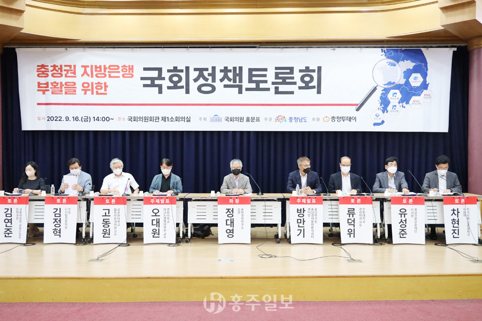 홍문표 국회의원(국민의힘, 홍성·예산) 주최로 지난 16일 국회의원회관 제1소회의실에서 열린 ‘충청권 지방은행 부활을 위한 국회정책토론회’에서 “납입 자본금 5000억 원은 넘어야 독자 생존이 가능하다”는 의견과 함께 “충청권 서민금융기관(저축은행, 신협, 새마을금고)과 인수합병도 추진해야 할 것”이라는 전문가 의견이 제시됐다.<사진>